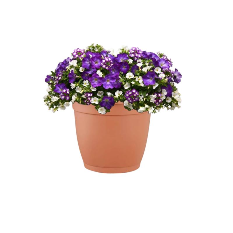 Each planter will include a combination of verbena, calibrachoa, and petunia plants. The plants are contained in a plastic terra cotta pot, which measures approximately 10" wide by 12" tall.