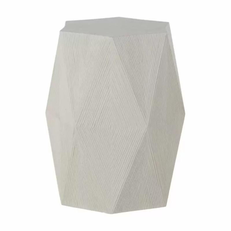 Description: The Albany Side Table is a hexagonal structure that has been crafted from cast stone, which is made in the Philippines with crushed stone and powerful binder to create this geometric shape with detailed grooves along the sides. The Albany Side Table works well alone or as a pair, both indoors and under covered outdoor rooms. It makes for a versatile piece that can be used with a variety of styles and rooms