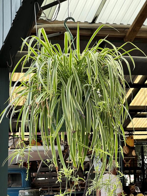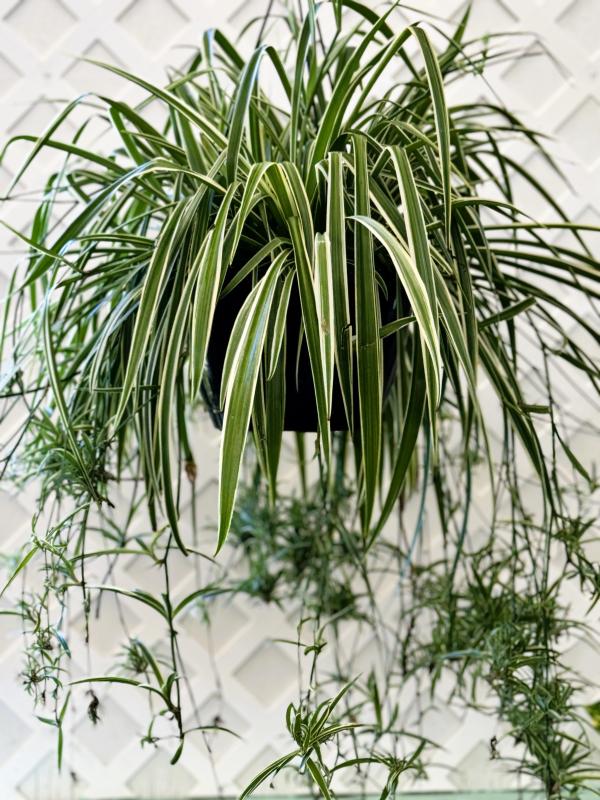 In southern Louisiana, Spider Plants in hanging baskets typically grow to a height of 6 to 12 inches with trailing stems that can extend up to 2 to 3 feet. They thrive in bright, indirect sunlight but can tolerate partial shade. Spider Plants are best kept indoors or brought inside when temperatures drop below 50°F, as they are sensitive to cold. They prefer well-drained soil and should be watered when the top inch of soil feels dry, being careful not to overwater to avoid root rot.