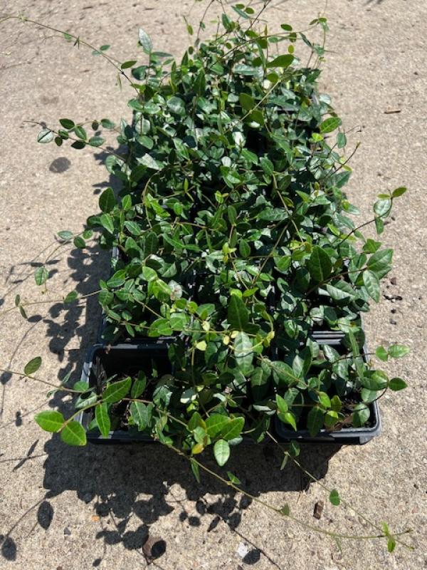 Asian Jasmine (Trachelospermum asiaticum) is a tough, fast-growing ground cover known for its dense, glossy green foliage that creates a lush carpet-like effect in landscapes.  Asian Jasmine has the ability to suppress weeds effectively, making it a popular choice for low-maintenance landscapes and areas where erosion control is needed.